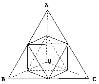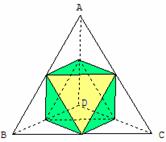 將一個正四面體的四個面上的各邊中點用線段連接,可得四個小正四面體及一個正八面體,如下圖所示。如果原四面體ABCD的體積為12,那麼此正八面體的體積為______