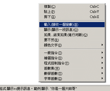 在寫程式時,如果你需要協助,或者想節省打字的時間,請按下滑鼠右鍵,會出現快速功能表,就可以直接選指令來用了,有的指令還能用點選的方式自動找出所要的座標哦!!