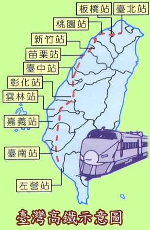高鐵路線自臺北到高雄左營,全長約345公里,使臺灣西部成為一日生活圈。