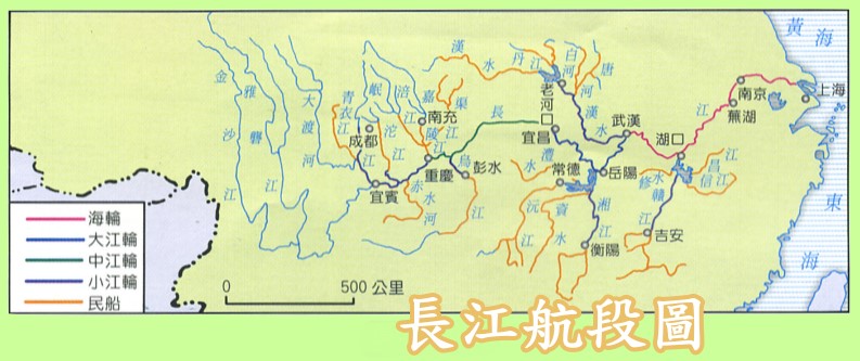 | 長江是中國第一大河,世界第三長河(第一:尼羅河,第二:亞馬孫河),具有 通行里程長且終年通航的優點,為中國內河航運的『黃金水道』;萬噸以上的輪船可行至南京,五千噸輪船可行至武漢。 | |