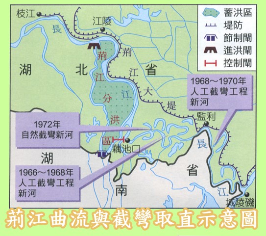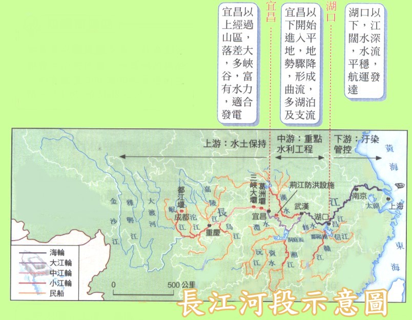 長江在宜昌以上經過山區,落差大,多峽谷,富水力,有葛洲壩與三峽大壩等水利工程;宜昌以下開始進入平原,地勢驟降,形成九曲迴腸的曲流地形,稱為『荊江河曲』,因此此段水患較多,多湖泊及支流;到湖口以下,江闊水深,航運發達,各盆地水系呈向心狀,並注入長江。 |