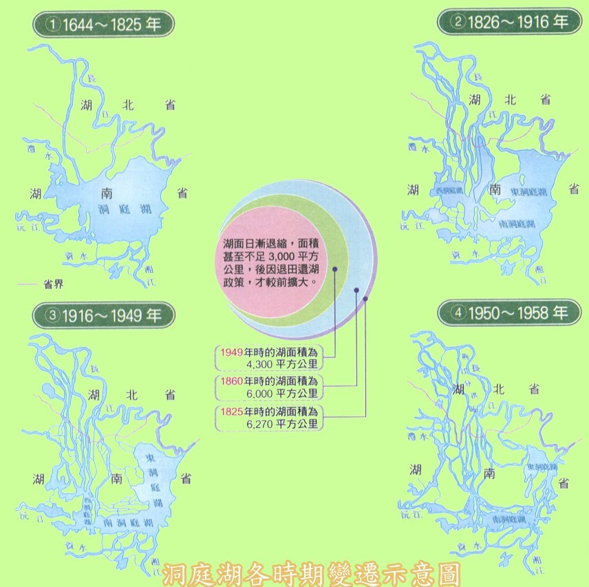 洞庭湖就是古代雲夢大澤的遺留。兩湖(湖北省、湖南省)地區的居民圍湖造田,雖然增加耕地面積,卻使得湖泊面積縮小,造成長江蓄水功能降低,水患加劇。