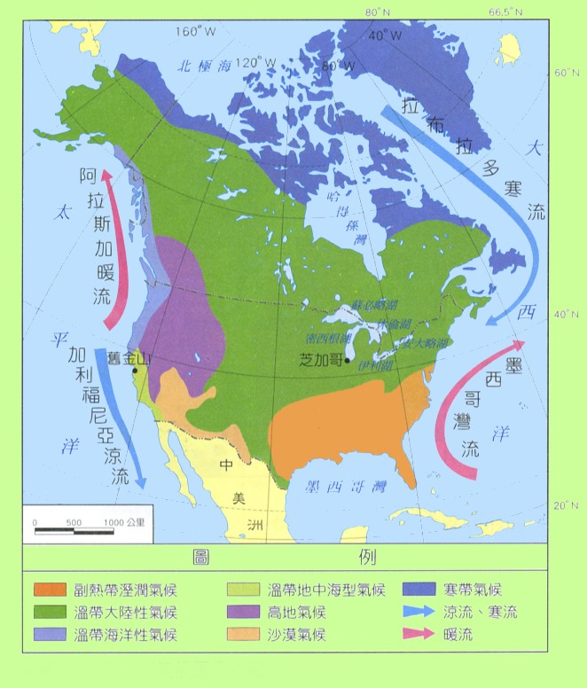 | 1.寒帶氣候: 北極圈內 2.溫帶大陸性氣候: 中部平原 3.溫帶海洋性氣候: 北緯40度以北的西部沿海 4.溫帶地中海型氣候: 北緯40度以南的西部沿海 5.高地氣候: 西部高山區 6.沙漠氣候: 西南部內陸山區 7.副熱帶濕潤氣候: 東南部 |