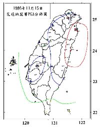 1986年11月15日晨5時20分,花蓮東方約20公里海底(23.992oN, 121.833oE, 震源深度15公里)發生芮氏地震規模(ML)6.8的強烈災害地震。