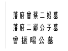 曾振暘墓坐北向南,花崗岩墓碑。入清後,為了使人民淡忘明鄭,於是下令凡是和明鄭相關的墓塚均需遷葬故里,唯有曾蔡二姬墓和二鄭公子墓留在台南。三座墳墓規模都不大,也沒有什麼華麗的裝飾,卻仍嚴守約定俗成的規制,由墓埕、供臺、墓碑、左右手及墓塚所組成。戰後曾加以整修,除墓碑外,大多近代之作品。