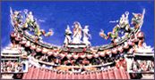 位於三川門廊堵下方的文字圖雕,將「福、祿、壽、山、海」五字巧妙的交織成花瓶形狀,喻指平安,由此可見傳統師匠將生活容於藝術的創意。廟中的簷口、橫樑處還遍佈著代替斗栱功能的「憨番」,造型多變,表情豐富,值得細細玩味。