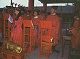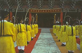 主祭官讀完祭文後,與祭的文官官員和文人學者要行三跪九叩禮,其間會演奏各種舞樂,叫作「佾舞」。佾舞的每一個動作,都是專家模仿「類官禮樂疏」中的明朝圖譜而來,主要是身體和手的動作。祭典開始,首先由樂生敲響置於儀門西側的晉鼓,鼓聲輕重有致,由緩而急,由弱轉強,而漸湲漸弱,至於無聲後,再重擊鼓心一響。