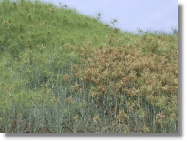 ___還有,濱刺麥雖然一長就是一大叢,但它們可是雌雄分居的喔!平時若沒生長在一起就會分別長成雄株、雌株兩個聚落;但是若有幸當鄰居時,也絕對各自選邊站,分得很清楚呢!不過即便如此,彼此之間還是會靠風兒這麼一吹,位在上風處的雄株就會將花粉送到下風處的雌株上,這種繁衍下一代的方式有點「酷」吧!