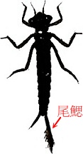 蜻蜓: 稚蟲(水蠆)生活在水中,腹部末端沒有尾腮,呼吸器官是直腸腮,也可用腹部吸飽水後,噴射前進 豆娘: 稚蟲(水蠆)也是生活在水中,體型多較纖細,腹部末端有2~3尾腮或肉突,可擺動游泳,也是呼吸器官 [結束] 或 [再看一次]