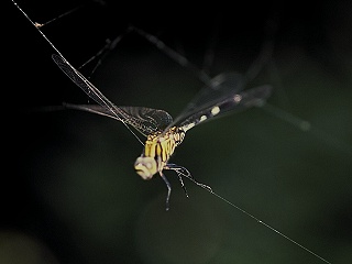 說明:蜻蜓雖然是武功高強的空中殺手,但自然環境中的天敵也不少,例如鳥類、蜥蜴、青蛙、螳螂等,最常見的便是誤中蜘蛛的天羅地網,難以逃脫,成為蜘蛛的一頓佳餚