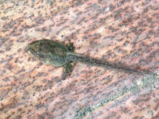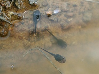 蝌蚪: 蛙卵孵化後便是蝌蚪,生活完全在水中,在水中以鰓和皮膚交換氣體呼吸。 當卵囊中的養分用完後,小蝌蚪便需自行在水中覓食,取食水中落葉、腐植質、藻類等,家中飼育時可餵食水族飼料、飯菜或水果、皮等。 蝌蚪的活動主靠鰭狀的長尾在水中擺動前進,白天的活動較少,多在夜間活動。生活在水流較強的種類,體型較流線型,並可利用嘴部的吸盤,固定以免著水流充走。 (左圖為翡翠樹蛙) |