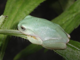 幼蛙: 離開水域生活的幼蛙,呼吸器官由鰓變成以肺來代替,體色與體態均與蝌蚪時期完全不同,如此成長時期的體態變化即稱為 變態。 其生活不會離開水源太遠,只吃小型蚊蠅,飼育時以腐爛水果吸引果蠅前來,供幼蛙捕食,約3~4個月後可長大為成蛙。 (左圖為莫氏樹蛙) |