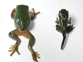 慢慢的,蝌蚪的後腿便長出來了 (左圖為台北樹蛙) |