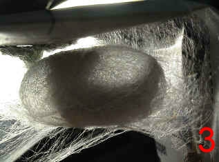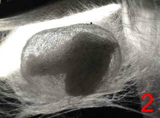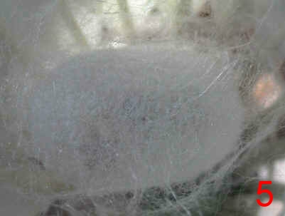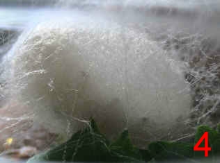 蠶寶寶在五齡蠶時會開始大量的吃桑葉,身體也拼命的長大,因為將有一場驚天動地的大轉變要發生。他必須儲備好能源,開始吐絲結繭,準備把自己包入其中變成蛹。 剛開始會排出含大量水分的濕便,然後爬到一個角落開始編織牠的帳幕(圖1),初期還可以看到他在半透明的繭裡上上下下(圖2、3),很難想像那麼胖的身軀要藏在裡面,還要進行體內大革命。