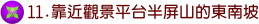 11至12之間,步道西側是垂直的山頭,約40-60公尺高,石灰岩壁上的坑洞有砂頁岩互層膠結其中,上面生長許多植物,放眼望去一片綠意盎然,