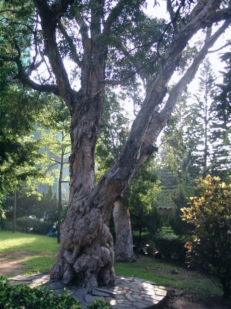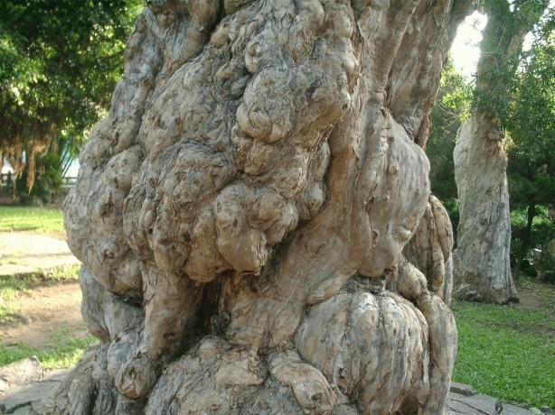 原產地為澳洲, 在日據時期被引進台灣, 常用為行道樹或庭園樹. 以前的小孩常將此樹皮剝下來當橡皮擦. 公園內這株白千層看來歷經風霜, 不僅樹幹粗獷, 多處地方還形成樹瘤, 可見年紀一定很大了.