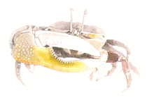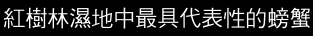螃蟹是「八足二螯」的甲殼類,螯就像人的雙手,八隻腳是活動橫行用的步足。在紅樹林沼澤中最常見的是清白招潮蟹(白扇招潮)、弧邊招潮蟹(網紋招潮)和北方呼招潮蟹(黃螯招潮)、台灣招潮蟹,這四種招潮蟹即使在長到最大,也不3至5公分而已,牠們最有趣的特徵是在雄蟹的兩隻螯腳,一邊是重型的巨大鉗腳,另一邊則是小巧可憐如叉子般的小螯腳,而雌蟹兩邊的螯腳則是一樣的小。