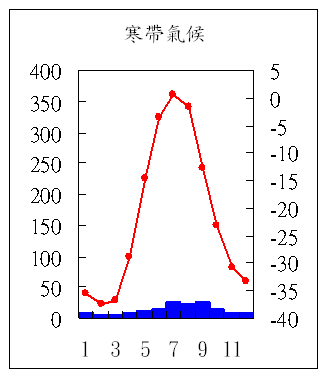 極圈以內(南北緯66.5度至南北緯90度之間) | 夏季短暫且涼冷,冬季漫長而嚴寒,年溫差大。 |