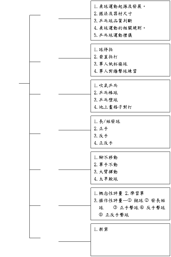 1. Åý¾Ç¥ÍÁA¸Ñ®à²y¹B°Ê¤¤¬ÛÃö¾¹§÷¤Î¸Ë³Æ¡A¥H¤Î®à²y¹B°Êªº³W«h¡C 2. §Q¥Î¦hºØ³Ð·N½ì¨ý¹CÀ¸¡A¼W¶i¾Ç¥Íªº¥â¥ã²y·P¤Î¤F¸Ñ¥â¥ã²yªº¯S©Ê¡C 3. Åý¾Ç¥ÍÁA¸Ñ®à²y¹B°Ê©Ò»Ýªº°ò¥»¹B°Ê§Þ¥©¡C 4. Åý¾Ç¥Í¸g¥Ñ¾Ç²ß®à²y°ò¥»§Þ¥©¡A´£¤É®à²y¹B°Ê§Þ¯à¡A°ö¾i¹B°Êªº¿³½ì¡C 5. Åý¾Ç¥Í¾Ç²ß¦Û§Ú¬D¾Ô¡Aµo´§¼ç¦b¯à¤O¤ÎªY½à§O¤H¤§ÀuÂI¡C 6. Åý¾Ç¥ÍÁA¸Ñ¤Î¿í¦u®à²y¹B°Ê³W«h¨Ã¶i¦æ¤À²Õ¹ï§Ü¡A®i²{¹B°Ê§»ö¡A°ö¾i¤£©}