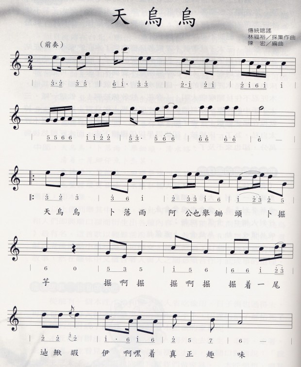 「天烏烏」是一首家喻戶曉、耳熟能詳的童謠,各種合唱表演或合唱比賽,都常常可以聽到這一首歌,有時候遊藝晚會也偶而會看到借歌中劇情配上歌曲來表演的節目演出,說誇張一點,甚至於連一些三歲小孩也都會唱上幾句「天烏烏欲落雨」的詞。這首歌的作曲者是林福裕先生,而它的歌詞原是一首童謠唸詞,有人認為天烏烏是台灣北部的民謠,據聞它是發源於金瓜石,但是從李獻璋「台灣民間文學集」,吳瀛濤「台灣諺語」、廖漢臣「台灣兒歌」、游國謙「民謠與我」等書的記載,及簡上仁先生的採集研究,發現本省以「天烏烏,欲落雨」為開頭句的歌謠分佈極廣,不論北、中、南部都有流傳,而且台北地區、彰化一帶、嘉南平原、高雄地區及屏東地區等地方均有之,每個地方都有以「天烏烏,欲落雨」為開頭的歌謠,只不過是它們的內容各有不同,甚至於有的地方一地之中同時還流傳二首以上同樣是用「天烏烏,欲落雨」作為開頭,內容卻不相同的歌謠。所以這一首歌謠原始的發源地究竟是在那裡,似乎也很難查考。