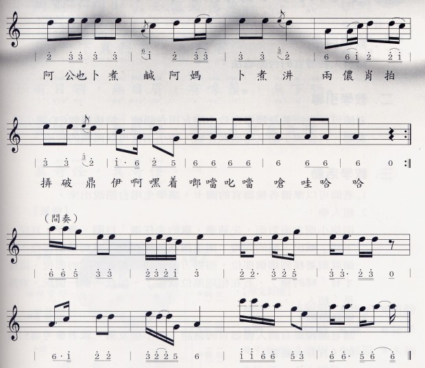 這一些童謠唸詞,都是開頭句相同,但是因為看各地習俗和即興意趣的不同,因此就衍生出很多的變體與變格,這一些童謠唸詞和目前流行的「天烏烏」的詞有很多的出入,所以我們可以瞭解目前流行的這種版本,可能是將流傳各地的內容,加以整編而成的,不同版本的天烏烏,都是類似順口溜式的架構及語句,因此其本身唸起來就極具節奏性,也富於一種輕快活潑感,整編成唱曲還是不失去其唸謠的特色,在歌詞中再穿插進「真正趣味」及「哈哈哈」「依呀哩」等表達笑聲及吆喝之聲,增加它的節奏感及趣味性使它更容易朗朗上口,因此這首歌的流傳面很廣,被唱的頻率也相對提高,多年來它一直是普受喜愛,很多演唱者,很多的合唱團體都競競相演唱,使它成為了極具代表性的一首台民謠。 這首歌以輕鬆的筆調,敘述阿公和阿嬤為了一個要煮鹹,一個要煮淡,僵持不下吵鬧不休,結果爭奪鍋子把鍋子打翻弄破了,其情節有趣,歌詞詼諧逗趣,令人莞薾,再加上曲調活潑輕盈,易於朗朗上口,且富於濃郁的鄉土色彩,因此頗為一般大眾所熱愛,不論男女老幼無不喜歡這首親切而樸實的歌謠,使它成為一首歷久不衰,百唱不厭的名曲。 有人說:「每一首民謠都是經過一段相當長的時間,不斷演化、創造、再生與融合所醞釀生成的,它們有看強烈而獨特的地方風格和氣質。」台灣民謠是產生自台灣這塊土地上,它自然的會呈現豐富的地方色彩,「天烏烏」既然是流傳很廣的台灣童謠唸詞,當然是充分展現了豐富的台灣色彩,不同的地方迭有變動,使它變得很多元,很豐富,這也充分呈現民間的創造力,經過整編後的唱曲,固然受到大家的歡迎,被大家熱烈的傳唱,但是流傳在各地區的唸詞,也值得我們細細品味,因為透過不同地方唸詞的比對,我們會發現,雖是同一個根源轉化演變出來的不同內容,是那麼的豐富,那麼的有趣,同時也是那麼的活潑,那樣的具有多元的想像空間,這真的是真正來自民間,活的一種平民音樂,唸詞中將水蛙、鯽仔魚、蝦、烏龜、田螺、蟳、蛇等田野水生動物都寫進去,擬人化了這些動物,去經營出一場歡樂有趣的迎親隊伍最是生動而充滿趣味。(王灝) |