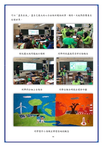 可以「盡其在我」,盡自己最大的心力去做好應做的事,總有一天能夠影響甚至 改變世界。 對校慶垃圾問題進行講解 同學們認真搜尋資料討論報告 同學們分組上台報告 同學在報告時提出環保呼籲 同學製作小海報宣傳愛惜地球觀念 98