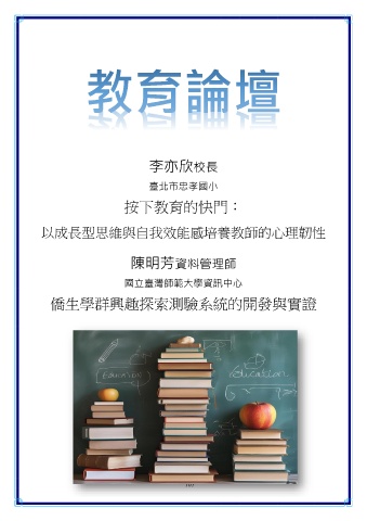 李亦欣校長 臺北市忠孝國小 按下教育的快門: 以成長型思維與自我效能感培養教師的心理韌性 陳明芳資料管理師 國立臺灣師範大學資訊中心 僑生學群興趣探索測驗系統的開發與實證 105