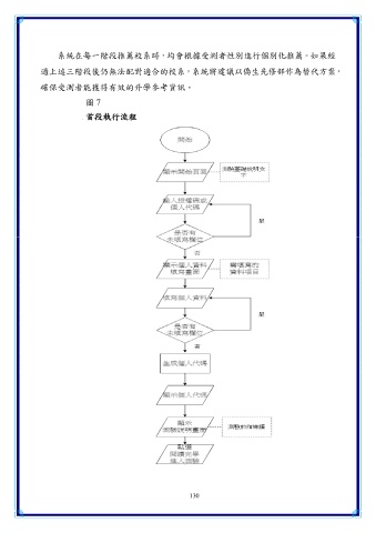 系統在每一階段推薦校系時,均會根據受測者性別進行個別化推薦。如果經 過上述三階段後仍無法配對適合的校系,系統將建議以僑生先修部作為替代方案, 確保受測者能獲得有效的升學參考資訊。 圖 7 首段執行流程 130