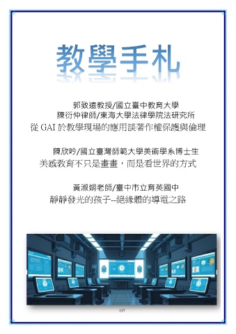 郭致遠教授/國立臺中教育大學 陳衍仲律師/東海大學法律學院法研究所 從 GAI 於教學現場的應用談著作權保護與倫理 陳欣吟/國立臺灣師範大學美術學系博士生 美感教育不只是畫畫,而是看世界的方式 黃淑娟老師/臺中市立育英國中 靜靜發光的孩子--絕緣體的導電之路 137