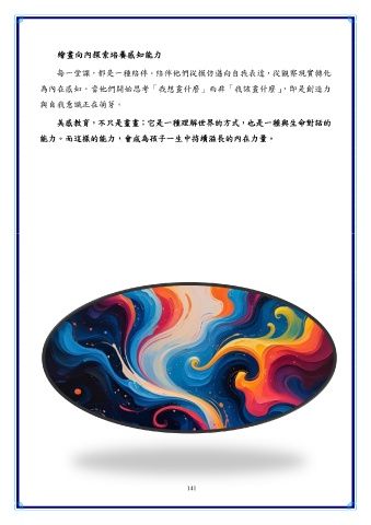 繪畫向內探索培養感知能力 每一堂課,都是一種陪伴。陪伴他們從模仿邁向自我表達,從觀察現實轉化 為內在感知。當他們開始思考「我想畫什麼」而非「我該畫什麼」,即是創造力 與自我意識正在萌芽。 美感教育,不只是畫畫;它是一種理解世界的方式,也是一種與生命對話的 能力。而這樣的能力,會成為孩子一生中持續滋長的內在力量。 141