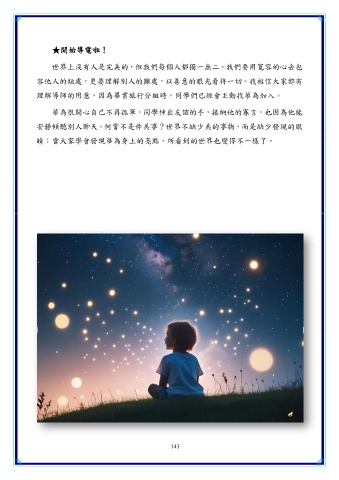 ★開始導電啦! 世界上沒有人是完美的,但我們每個人都獨一無二。我們要用寬容的心去包 容他人的短處,更要理解別人的難處,以善意的眼光看待一切。我相信大家都有 理解導師的用意,因為畢業旅行分組時,同學們已經會主動找華為加入。 華為很開心自己不再孤單,同學伸出友誼的手,接納他的寡言,也因為他能 安靜傾聽別人聊天,何嘗不是件美事?世界不缺少美的事物,而是缺少發現的眼 睛;當大家學會發現華為身上的亮點,所看到的世界也變得不一樣了。 143