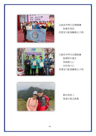 全國高中學生技藝競賽 指導李育宸 榮獲室內配線職類金手獎 全國高中學生技藝競賽 指導學生選手 林諭敬(左) 田任珈(右) 榮獲室內配線職類金手獎 假日與家人 桃源谷縱走挑戰 150