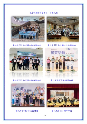 臺北市教師研習中心~活動花絮 臺北市 113 年度國小校長儲訓班 臺北市 113 年度國中主任儲訓班 臺北市 113 年度國中校長儲訓班 臺北市優質學校頒獎典禮 臺北市杏壇芬芳表揚典禮 臺北教育 111 標竿學校 158